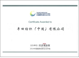 2014年9月26日、中国上海市——由《经济观察报》主办的“2014中国最具创新企业评选”在北京揭晓、全球领先的汽车内饰系统供应商丰田纺织中国地区总部——丰田纺织(中国)有限公司凭借在新型环保内饰材料技术的研发制造以及在企业经营管理、技术研发上的创新荣获“2014中国最具创新企业”称号。
